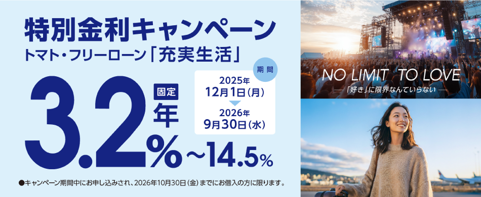 | お借入利率 | 固定金利 年3.2%〜年14.5% ※ご契約時の利率が最終返済時まで適用されます。 ※お借入利率は所定の審査によります。 ※延滞利率は、年14.0%または年14.5%です。 |